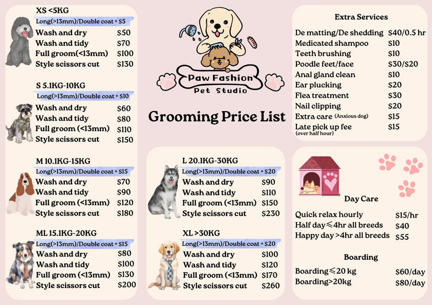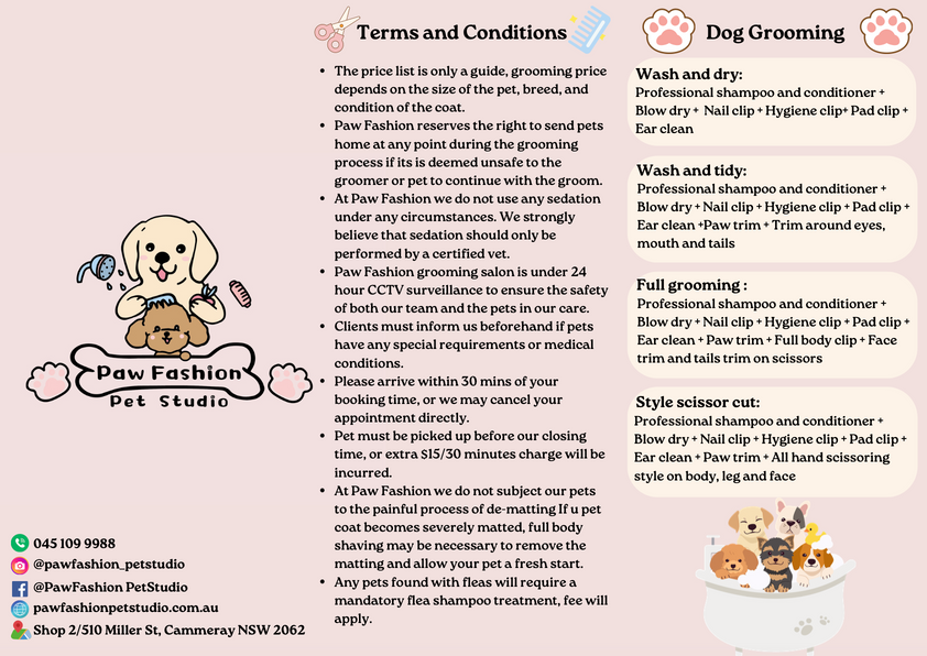 At PAW FASHION PET STUDIO, we offer top-notch grooming services that will leave your dog looking and feeling fabulous! Our experienced groomers provide gentle, loving care in a stress-free environment. Book your appointment today and give your pup the pampering they deserve!